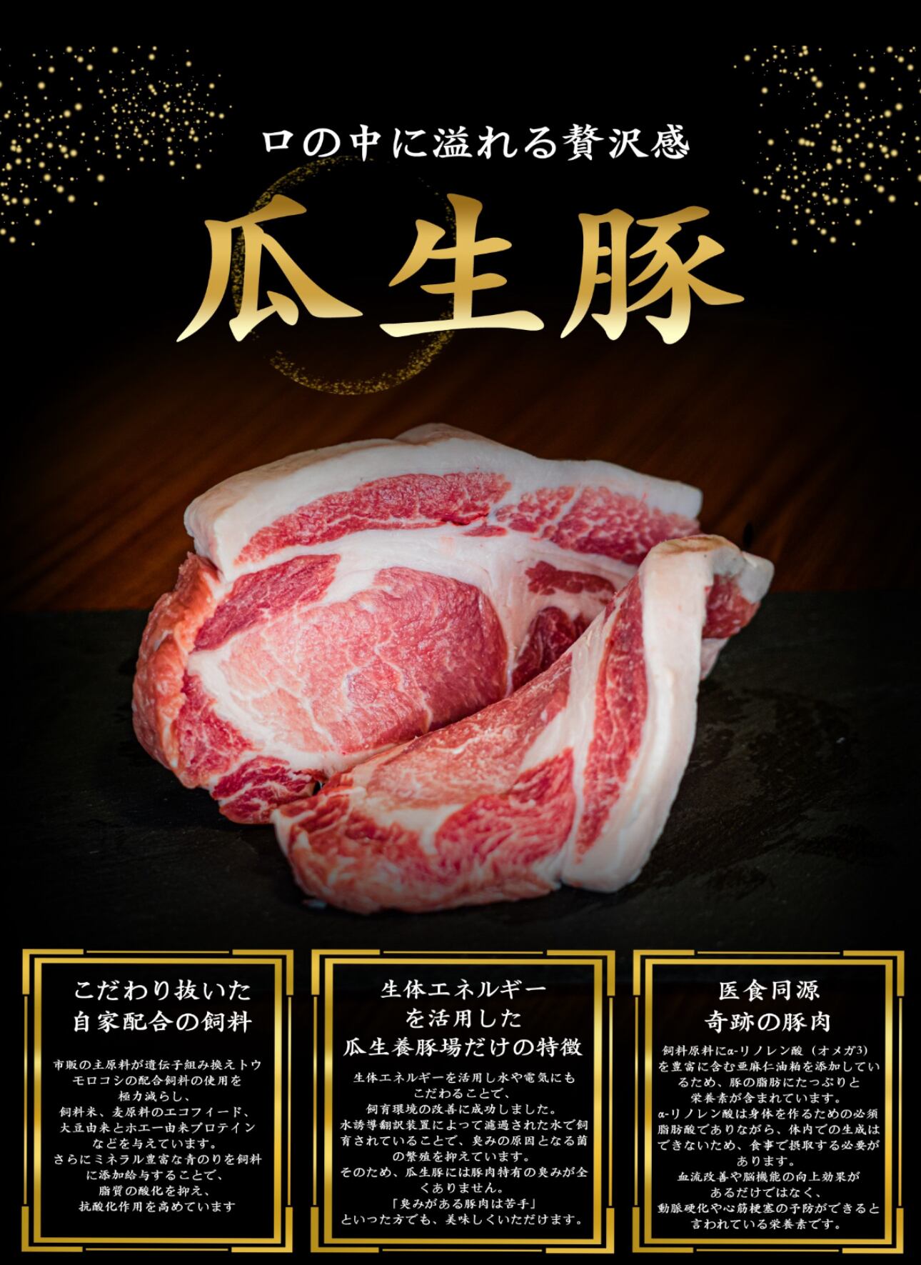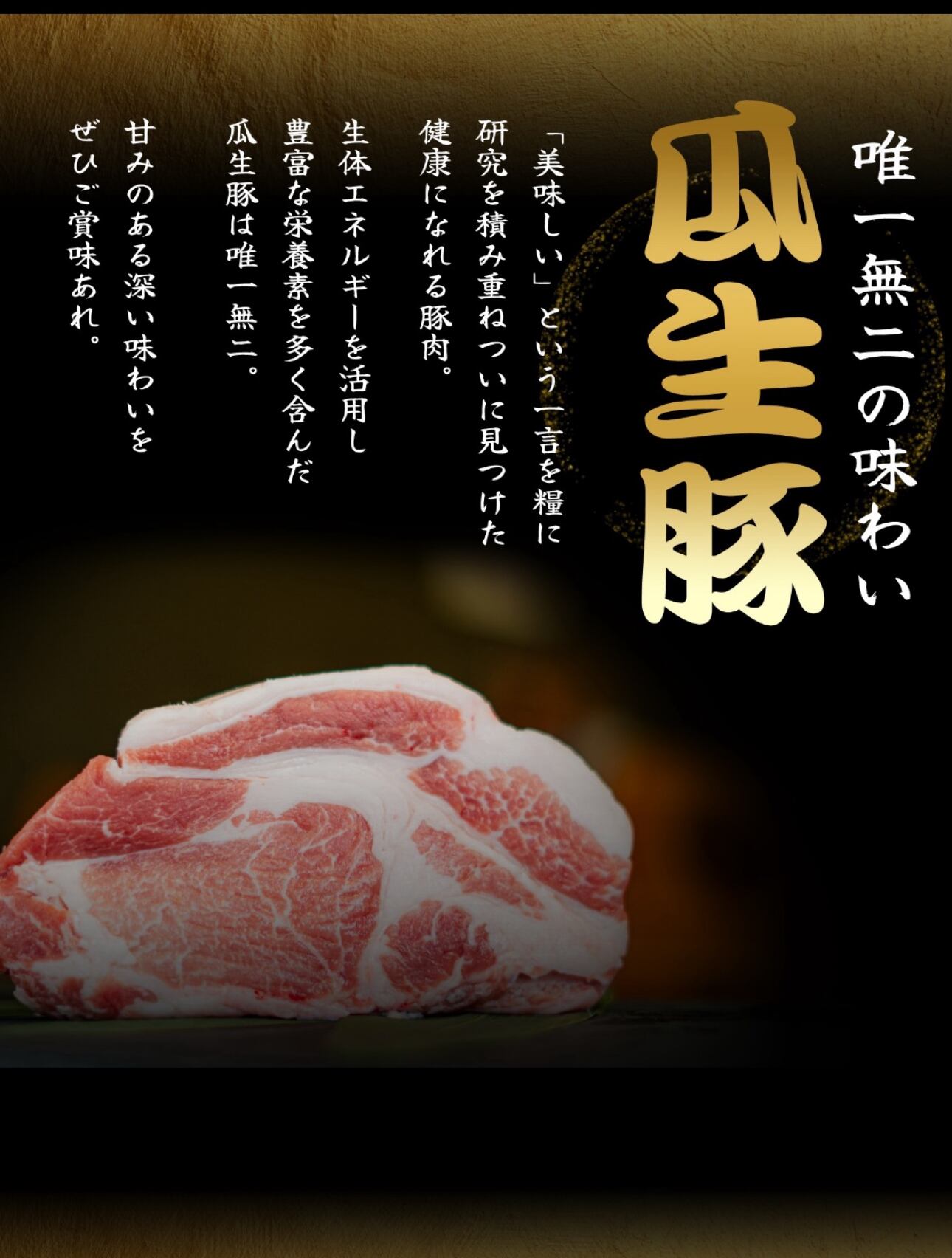 瓜生豚は豚特有の臭さが少なく、脂肪分にオメガ3と呼ばれるアルファリノレン酸が含まれ脂が甘いのが特徴です。